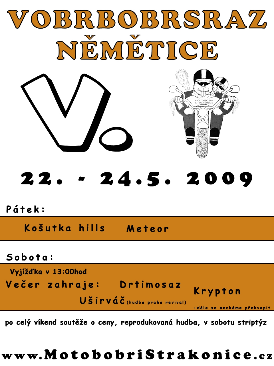 dovolujeme si Vás pozvat na náš výroční 5. VOBRBOBRSRAZ 22.-24.5.2009 do Němětic u Strakonic. Bližší informace najdete v přiloženém letáčku!